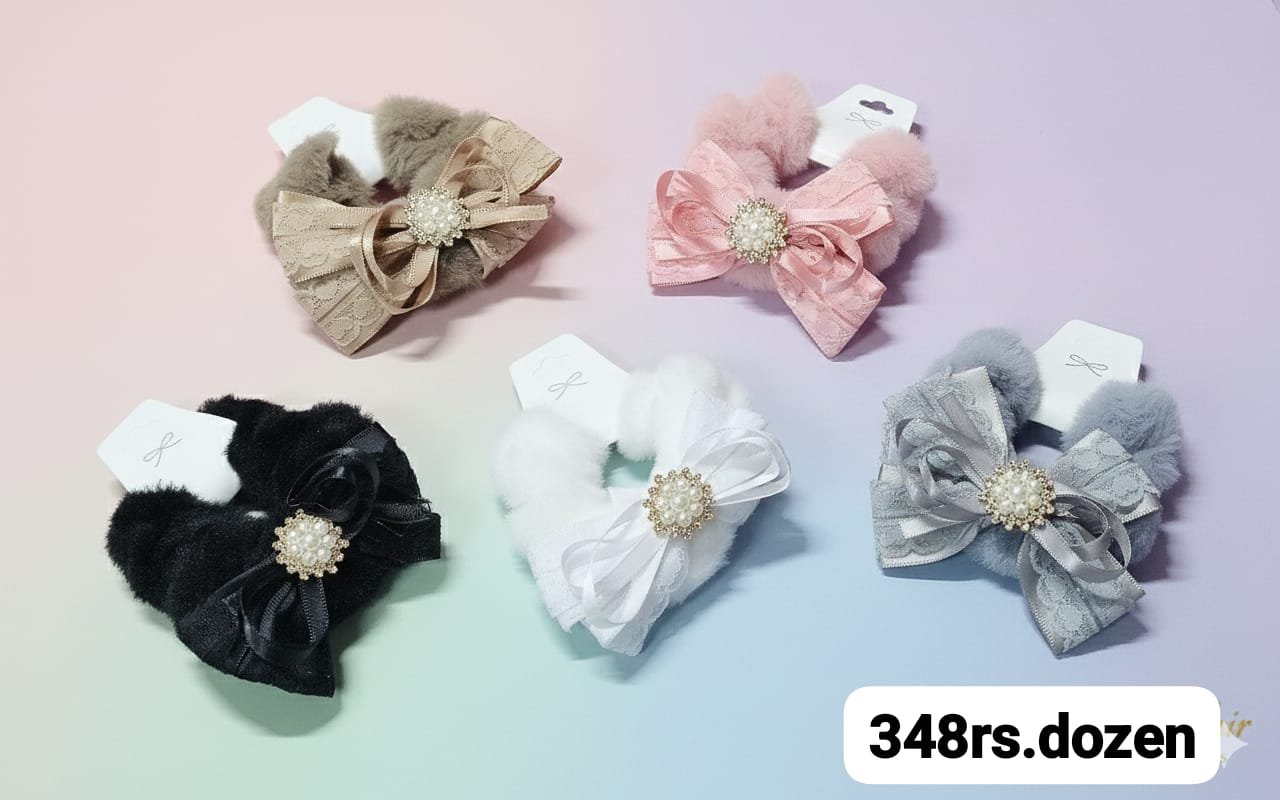 KOREAN FUR SCRUNCHIES WITH BOW AND STONE (PACK OF 12)